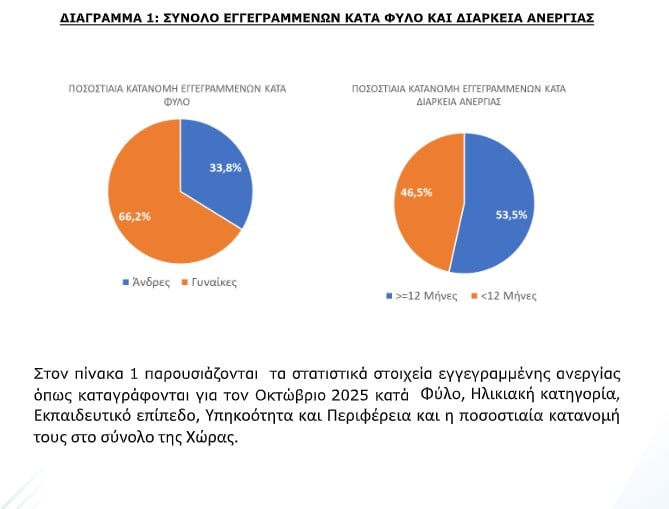 Από το σύνολο των εγγεγραμμένων για τον μήνα Οκτώβριο 2025, 410.859 (ποσοστό 53,5%) άτομα είναι εγγεγραμμένα στο μητρώο της ΔΥΠΑ για χρονικό διάστημα ίσο ή και περισσότερο των 12 μηνών και 357.142  (ποσοστό 46,5%) είναι εγγεγραμμένα στο μητρώο της ΔΥΠΑ για χρονικό διάστημα μικρότερο των 12 μηνών.