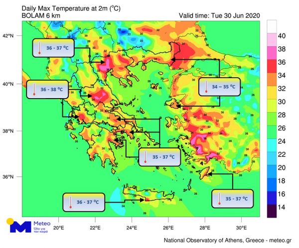 Θερμοκρασία: Από 17 έως 37 βαθμούς Κελσίου. Στη δυτική Μακεδονία η ελάχιστη 2 με 4 βαθμούς χαμηλότερη.