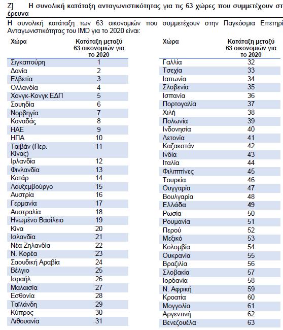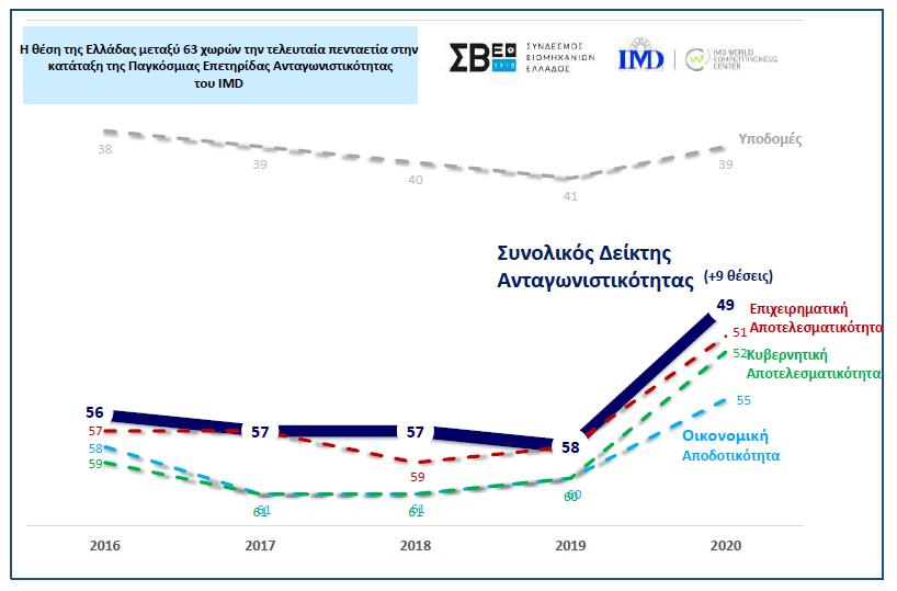 Σύμφωνα με τα στοιχεία του Institute for Management Development (IMD) της Ελβετίας, η ανταγωνιστική θέση της Ελλάδας κατά το 2020 παρουσίασε σημαντική άνοδο κατά εννέα (9) θέσεις και εφέτος βρίσκεται στην 49η θέση μεταξύ 63 οικονομιών, από την 58η την οποία κατείχε την περσινή χρονιά, δηλαδή το 2019.