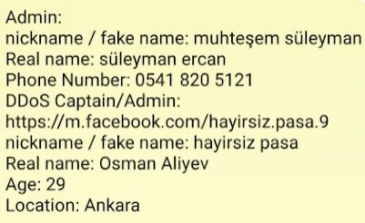 Σε σχετική ανακοίνωση σημείωσαν: «Όπως είπαμε σας δίνουμε παρακάτω τα πραγματικά στοιχεία των Τούρκων “χακερς”, του admin των Aslan Neferler Tim και του recruiter των Anka Neferler Tim, οι οποίοι επιτέθηκαν στις ιστοσελίδες της χώρας μας».