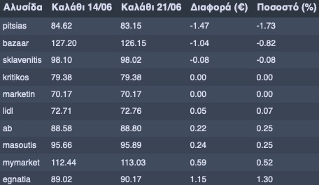 Αναλυτικά στον πίνακα το κόστος του «Καλαθιού του Νοικοκυριού» ανά σούπερ μάρκετ και η μεταβολή του από την 33η στην 34η εβδομάδα.