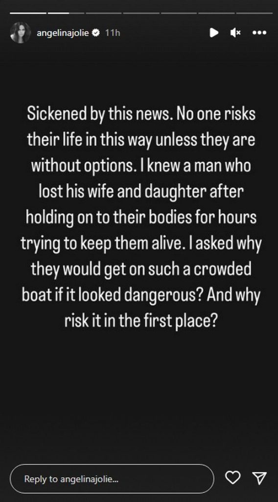 Μεταξύ των ανθρώπων από όλο τον κόσμο που πήραν θέση για το τραγικό συμβάν ήταν και η Αντζελίνα Τζολί, η οποία σε μακροσκελή ανάρτηση που έκανε στον λογαριασμό της στο Instagram και μάλιστα σε μαύρο φόντο, μοιράστηκε τις σκέψεις και τα συναισθήματά της, επαναλαμβάνοντας πως κανείς δεν θέτει τη ζωή του σε κίνδυνο παρά μόνο όταν δεν έχει άλλη επιλογή.