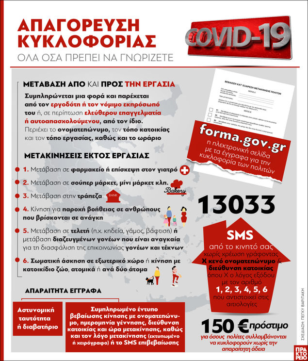 Σε εφαρμογή έχει τεθεί από τις 6 το πρωί η απαγόρευση κυκλοφορίας που ανακοίνωσε ο πρωθυπουργός Κυριάκος Μητσοτάκης σε μια προσπάθεια να περιοριστεί η διασπορά του κοροναϊού στην Ελλάδα.