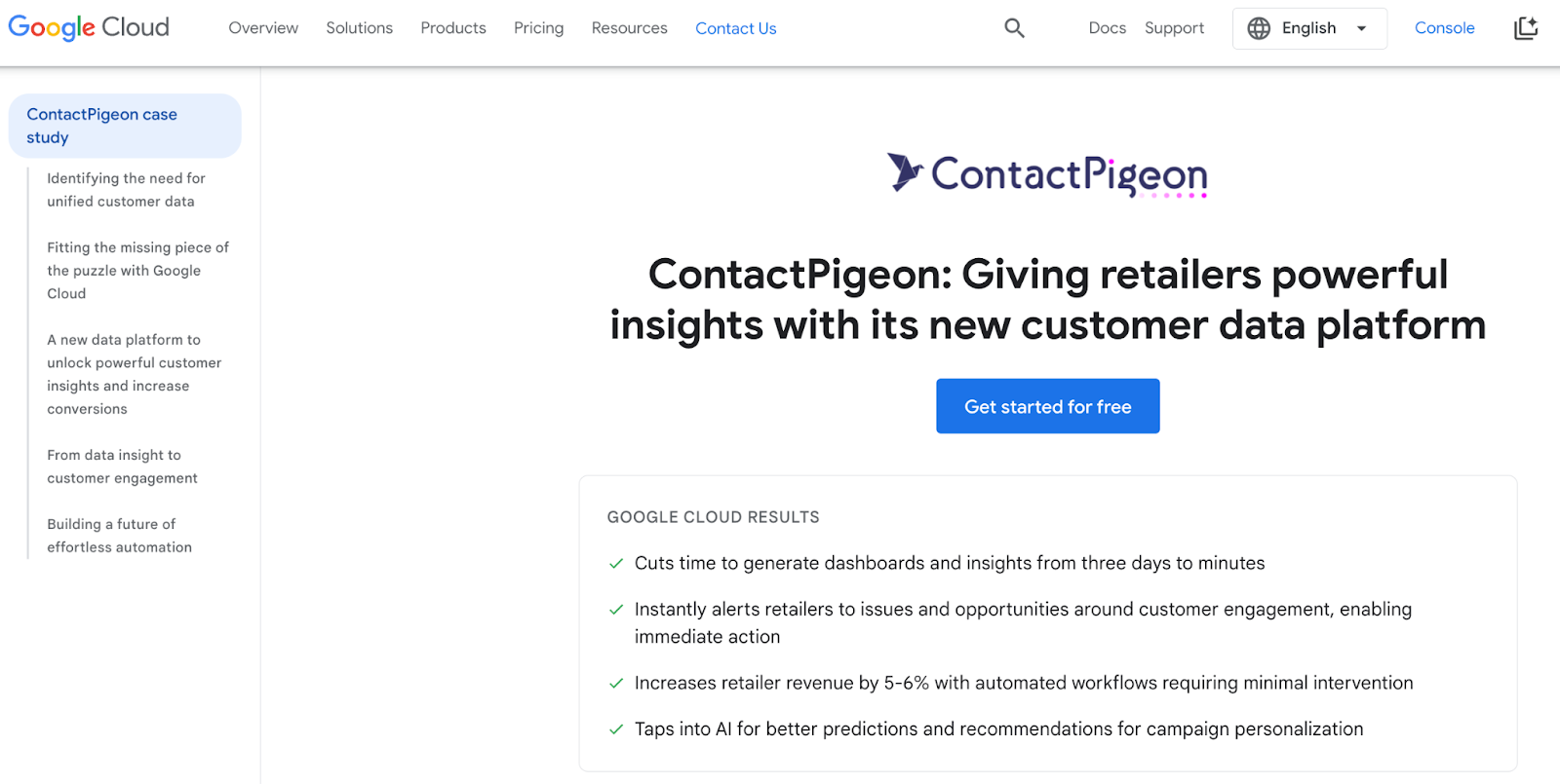Η επιλογή της υποδομής της Google αποτέλεσε στρατηγική απόφαση, αφού μας επιτρέπει να συλλέγουμε, να αποθηκεύουμε και να αναλύουμε δεδομένα με αξιοπιστία και ταχύτητα αξιοποιώντας την τελευταία έρευνα στο πεδίο της Τεχνητής Νοημοσύνης. Αυτή η προσέγγιση διασφαλίζει ότι το CDP της ContactPigeon προσφέρει μια ολοκληρωμένη λύση, ικανή να προσαρμοστεί στις απαιτήσεις του σήμερα, αλλά και του αύριο.