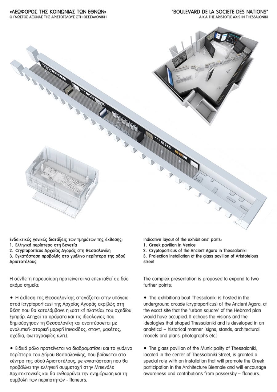 Η επιλογή του παραδείγματος της Θεσσαλονίκης για την Μπιενάλε Αρχιτεκτονικής του 2020 στη Βενετία επιχειρεί να αναδείξει ένα πολυπολιτισμικό σταυροδρόμι, με διαρκή μητροπολιτική λειτουργία που είναι ιδιαίτερα ορατή στο παλίμψηστο του κεντρικού άξονα. Η έκθεση επικεντρώνεται στη μεγάλη χειρονομία που λειτούργησε ως επίκεντρο του αστικού εκσυγχρονισμού «ΛΕΩΦΟΡΟΣ ΤΗΣ ΚΟΙΝΩΝΙΑΣ ΤΩΝ ΕΘΝΩΝ» Ο ΓΝΩΣΤΟΣ ΑΞΟΝΑΣ ΤΗΣ ΑΡΙΣΤΟΤΕΛΟΥΣ ΣΤΗ ΘΕΣΣΑΛΟΝΙΚΗ και της πολιτικής διαχείρισης της μνήμης με οριενταλιστικές «νεοβυζαντινές» αρχιτεκτονικές μορφές. Η κεντρική αστική πλατεία συνέπεσε, όχι τυχαία, με την αρχαία αγορά. Η ανασκαφή του forum ήταν από τους βασικούς λόγους, για τους οποίους το αρχικό όραμα παραμένει ανολοκλήρωτο.