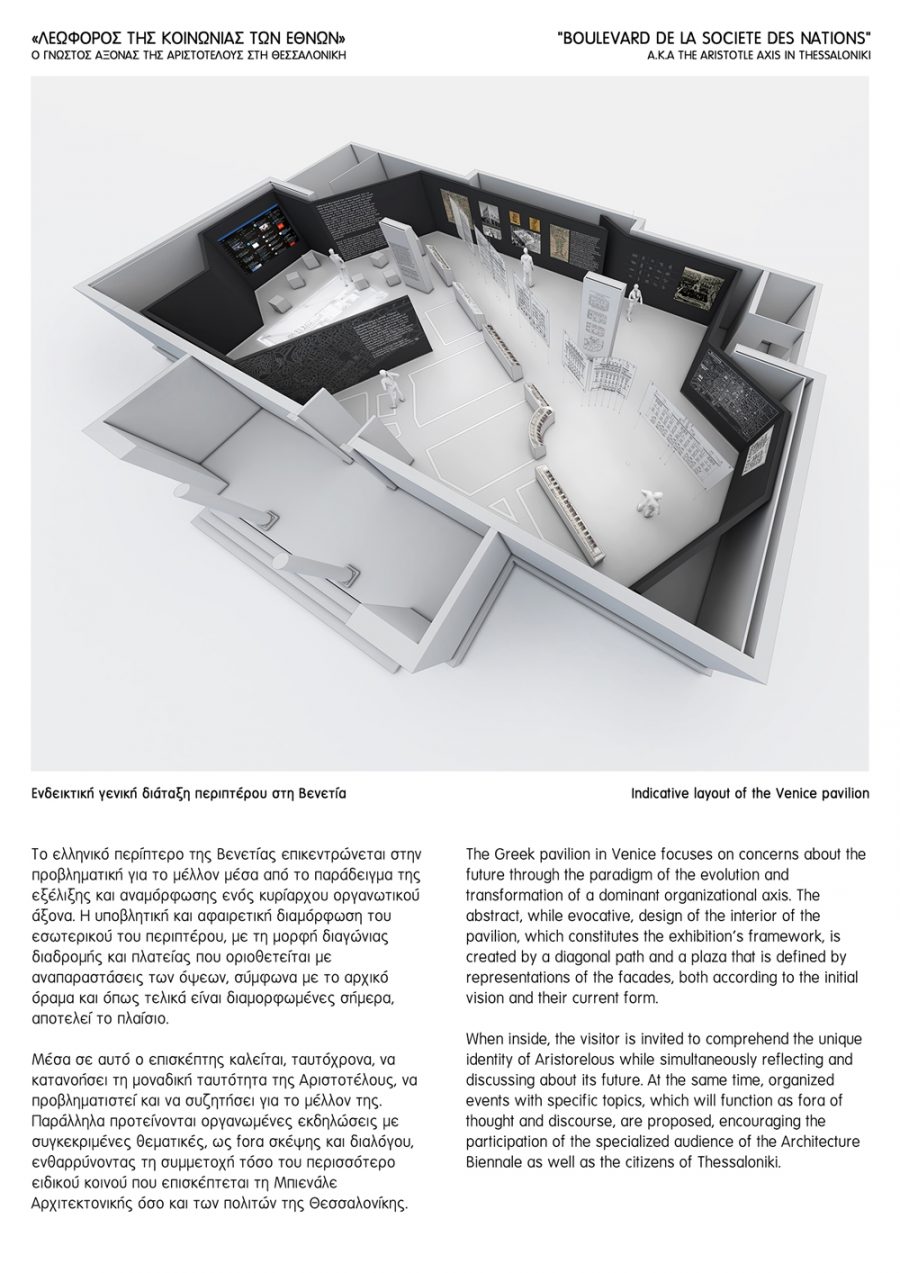 Η ελληνική συμμετοχή επιχειρεί να δώσει μια απάντηση στο κεντρικό θέμα της έκθεσης «How will we live together?» (Πώς θα ζήσουμε μαζί;), το οποίο πραγματεύεται τη διερεύνηση ενός νέου χωρικού κοινωνικού συμβολαίου, αναγκαίου σε ένα περιβάλλον αυξανόμενων οικονομικών, κοινωνικών και πολιτικών ανισοτήτων, παρουσιάζοντας την αρχιτεκτονική και πολεοδομική διαδρομή του Άξονα της Αριστοτέλους. Πρόκειται για μια μεγάλη πολιτική χειρονομία αστικού εκσυγχρονισμού, που σχεδιάστηκε από το Γάλλο αρχιτέκτονα-πολεοδόμο Ερνέστ Εμπράρ πριν από 100 ακριβώς χρόνια ως ένα πολυπολιτισμικό σταυροδρόμι. Η διαρκής μητροπολιτική λειτουργία αυτού του δημόσιου χώρου έχει κεντρική θέση στο παλίμψηστο της νεότερης Θεσσαλονίκης.