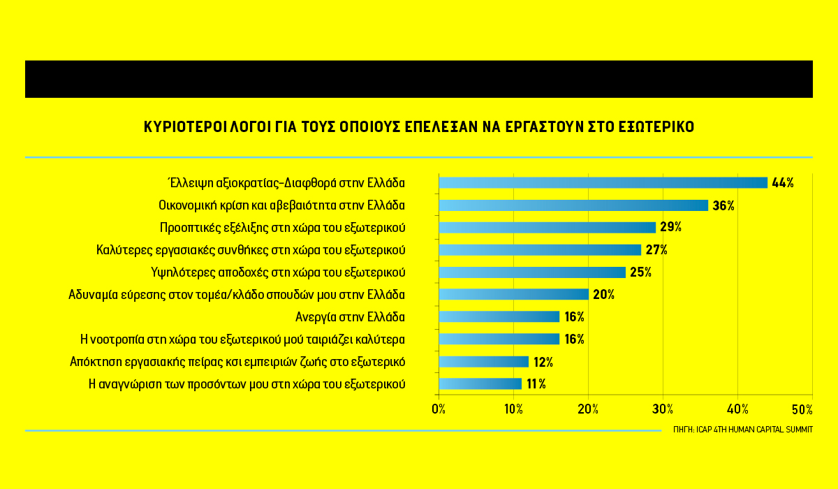 Σε πρόσφατη έρευνα της ICAP σε Έλληνες που έφυγαν και εργάζονται πλέον στο εξωτερικό, 4 στους 10 απάντησαν ότι δεν σκέφτονται να γυρίσουν πίσω, δίνοντας ως σημαντικότερο λόγο την έλλειψη αξιοκρατίας/διαφάνειας (44%) και την αβεβαιότητα/ οικονομική κρίση (36%).