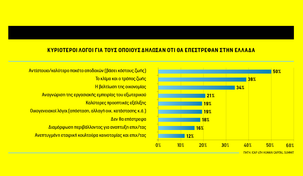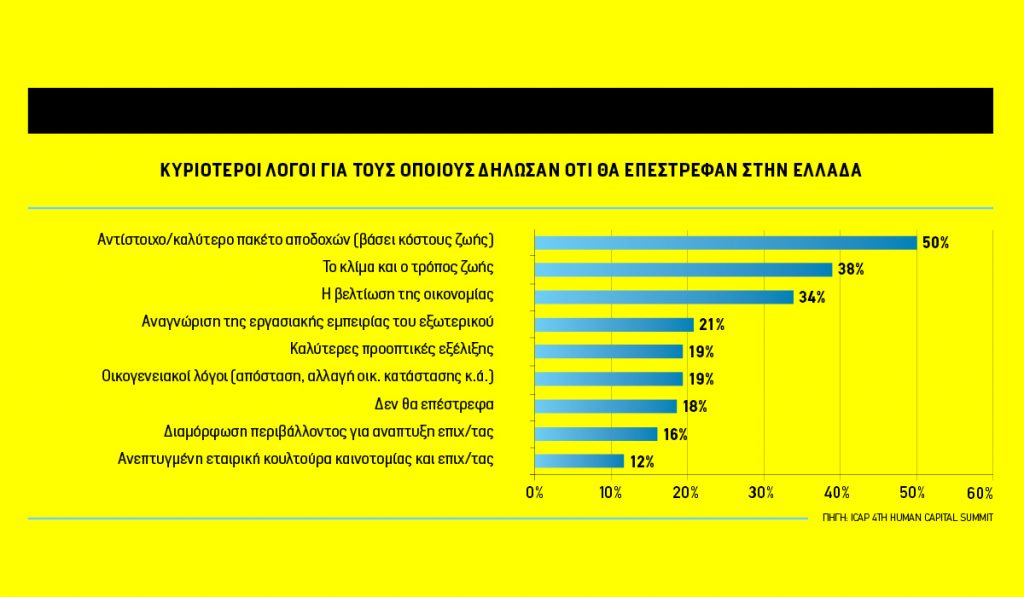 Ένας στους δύο συμμετέχοντες δήλωσε ότι θα επέστρεφε εάν είχε τα ίδια ή καλύτερα έσοδα με αυτά που έχει στο εξωτερικό, ενώ άλλοι ανέφεραν ως λόγο ενδεχόμενης επιστροφής τους την οικογένειά τους, το κλίμα και τον τρόπο ζωής, τη βελτίωση της οικονομίας και την αναγνώριση της εργασιακής εμπειρίας που συγκέντρωσαν στο εξωτερικό. Σύμφωνα με την έρευνα, 19% είναι μηχανικοί, 12% απασχολούνται στον κλάδο της πληροφορικής και 35% στην οικονομία, τη διοίκηση και το marketing.