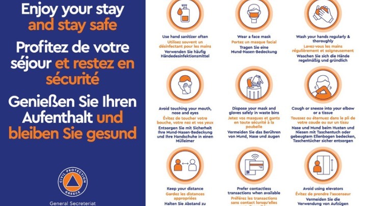 Με κεντρικό μήνυμα «Απολαύστε τη διαμονή σας – Μείνετε ασφαλείς» (Enjoy your stay and stay safe), η Γενική Γραμματεία Πολιτικής Προστασίας (ΓΓΠΠ) προχώρησε στην έκδοση εννέα οδηγιών για τη λήψη των απαραίτητων μέτρων προστασίας από τον κορωνοϊό, με δεδομένο ότι από την 1η Ιουλίου «ανοίγουν» 41 πύλες εισόδου στην Ελλάδα και ειδικότερα 27 αεροδρόμια, 7 χερσαία σημεία εισόδου και 7 λιμάνια.