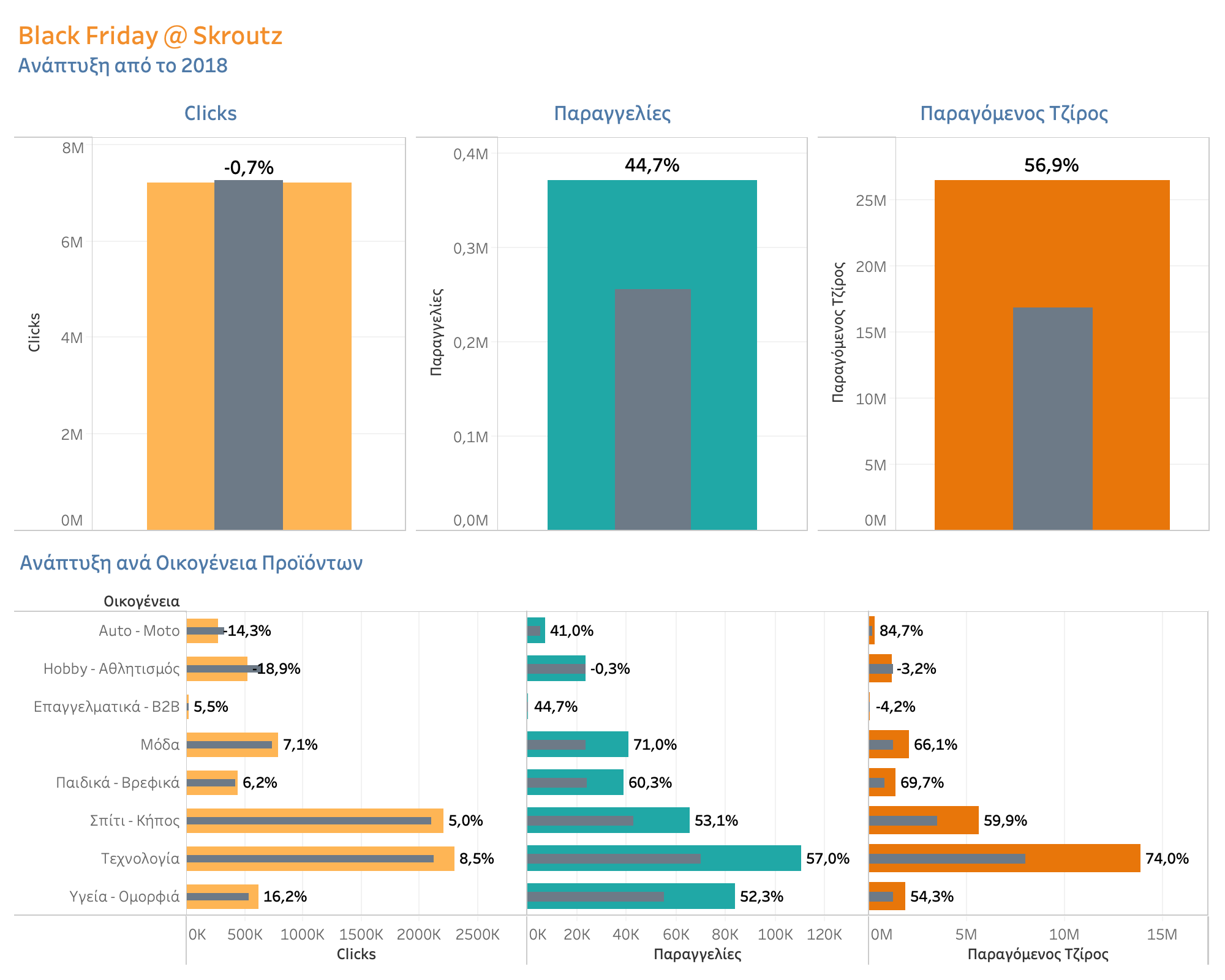 Μελετώντας τις οικογένειες προϊόντων του Skroutz και το πώς συμπεριφέρθηκαν οι βασικές κατηγορίες, η Τεχνολογία και το Σπίτι – Κήπος βρέθηκαν στο επίκεντρο του ενδιαφέροντος των καταναλωτών, απορροφώντας το σημαντικότερο ποσοστό των clicks, του παραγόμενου τζίρου και του όγκου των παραγγελιών. Επιπλέον, η Υγεία – Ομορφιά αν και βρίσκεται στην 5η θέση κατάταξης με συνολικά clicks (8,3%), είχε τον 3ο μεγαλύτερο όγκο παραγγελιών επί του συνόλου με 48.700 παραγγελίες (18,8%), γεγονός που οφείλεται στο ότι ναι μεν πρόκειται για μικρής αξίας προϊόντα, ωστόσο υπάρχει αυξημένος αριθμός προϊόντων ανά καλάθι αγοράς.