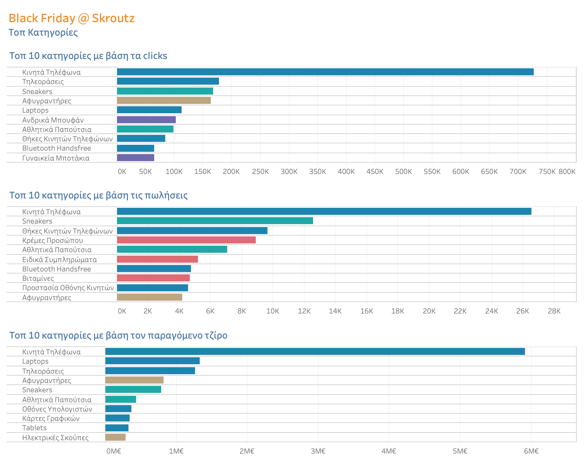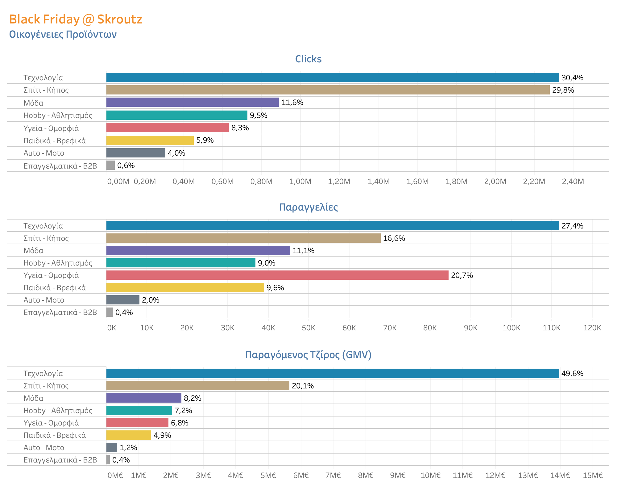 Στο γράφημα παρακάτω φαίνονται οι Top 10 κατηγορίες βάσει πωλήσεων, clicks και παραγόμενου τζίρου (GMV):