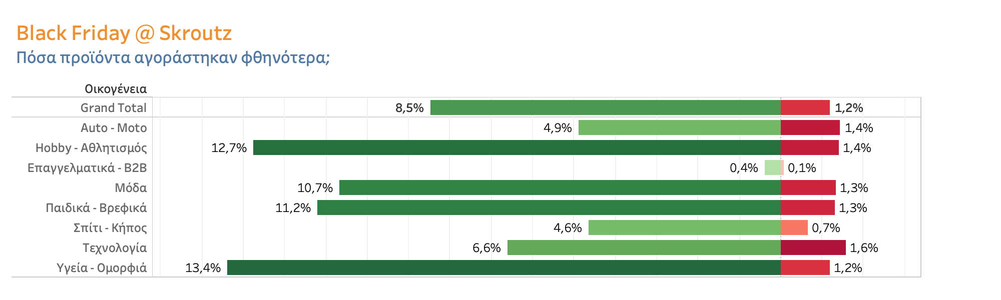 Όσον αφορά τις εκπτώσεις που εφαρμόστηκαν και αξιοποιήθηκαν από τους χρήστες του Skroutz, κάθε κατηγορία προϊόντων παρουσίασε διαφοροποιημένη συμπεριφορά. Η μελέτη των στατιστικών της πλατφόρμας αποκαλύπτει ότι οι κατηγορίες προϊόντων Υγείας & Ομορφιάς και Χόμπι – Αθλητισμός είχαν τις σημαντικότερες εκπτώσεις και έτσι κατατάσσονται στην κορυφή της λίστας των προϊόντων που αγοράστηκαν φθηνότερα σε σχέση με την κανονική τους τιμή.