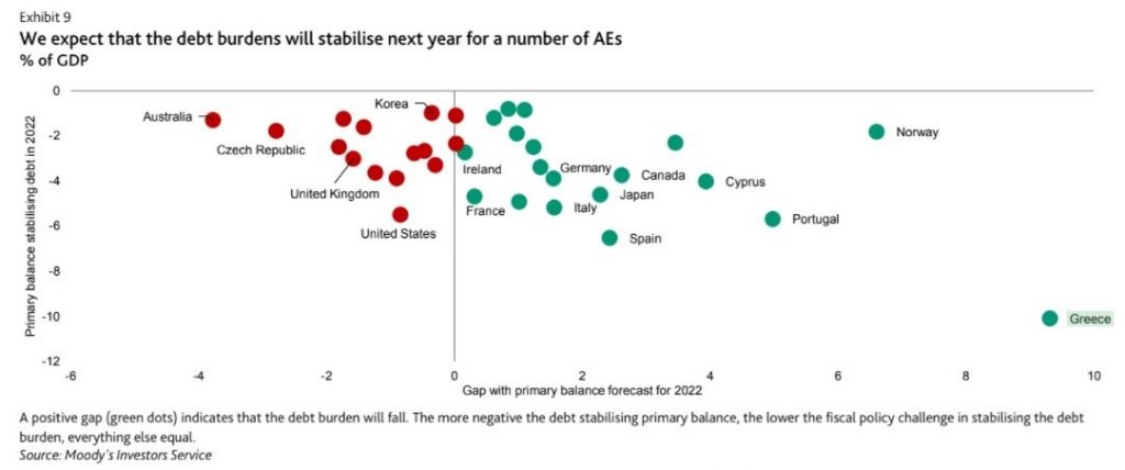 Κράτη όπως π.χ. η Γαλλία (αξιολόγηση Aa2 σταθερό), η Ιαπωνία (A1 σταθερό), το Ηνωμένο Βασίλειο ( Aa3 σταθερό) και οι Ηνωμένες Πολιτείες (ΗΠΑ, Aaa σταθερό) θα έχουν σημαντικά υψηλότερα βάρη χρέους από ό,τι πριν από την πανδημία, εκτός εάν επιτύχουν πολύ ταχύτερη δημοσιονομική εξυγίανση και / ή διατηρήσιμη ανάπτυξη από ό,τι αναμένει η Moody’s σήμερα και από ό,τι έχουν πετύχει στο παρελθόν.