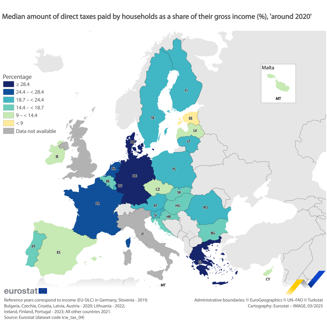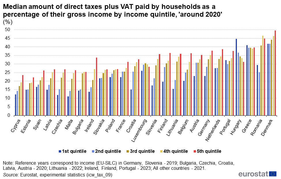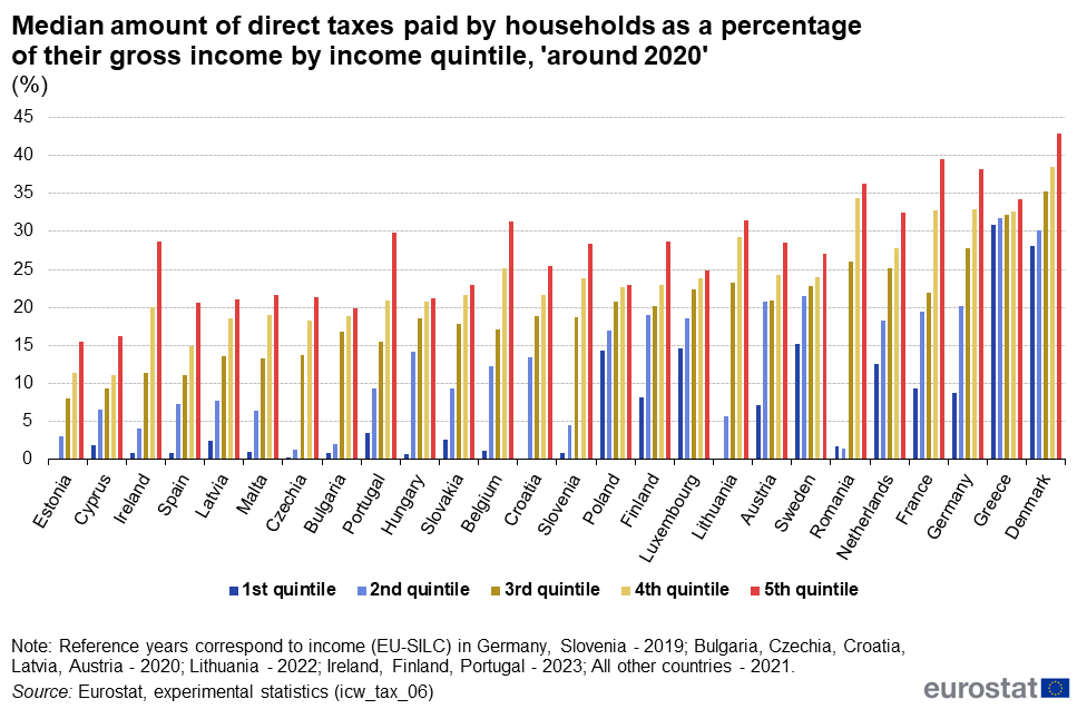 Στην Ελλάδα, το χαμηλότερο πεντημόριο νοικοκυριών πληρώνει πάνω από το 33% του ακαθάριστου εισοδήματος του σε άμεσους φόρους, ενώ το υψηλότερο πεντημόριο πληρώνει κοντά στο 35%.
