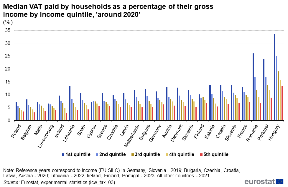 Για τον φόρο προστιθέμενης αξίας, τα φτωχότερα νοικοκυριά πληρώνουν το υψηλότερο μερίδιο ΦΠΑ προς το ακαθάριστο εισόδημα τους, με στοιχεία του 2021, ξεπερνώντας το 10%.