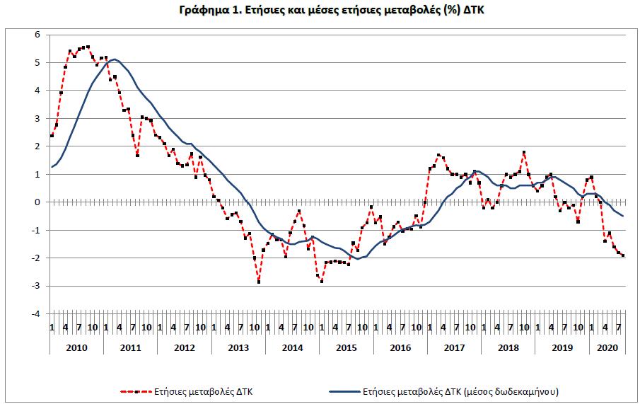 Ο μέσος ΕνΔΤΚ του δωδεκαμήνου Σεπτεμβρίου 2019 – Αυγούστου 2020, σε σύγκριση με τον αντίστοιχο Δείκτη του δωδεκαμήνου Σεπτεμβρίου 2018 – Αυγούστου 2019, παρουσίασε μείωση 0,4% έναντι αύξησης 0,8% που σημειώθηκε κατά την αντίστοιχη σύγκριση του δωδεκαμήνου Σεπτεμβρίου 2018 – Αυγούστου 2019 με το δωδεκάμηνο Σεπτεμβρίου 2017 – Αυγούστου 2018.