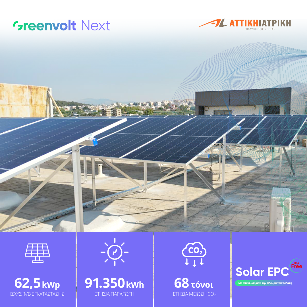 Συγκεκριμένα, στην Αττική Ιατρική εγκαταστάθηκε φωτοβολταϊκό σύστημα ισχύος 62,5 kWp, το οποίο αναμένεται να παράγει σε ετήσια βάση 91.350 kWh. Η ενεργειακή αυτή απόδοση αντιστοιχεί σε σημαντική εξοικονόμηση κόστους για την επιχείρηση, αλλά και σε μείωση εκπομπών CO₂ κατά 68 τόνους ετησίως.