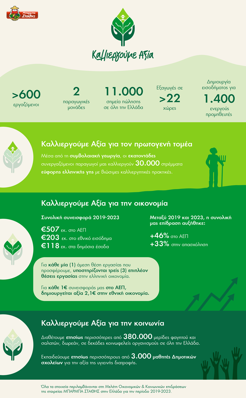Η Μελέτη καλύπτει την πενταετία 2019–2023 και ποσοτικοποιεί τις επιδράσεις της Εταιρείας και των δραστηριοτήτων της στους τομείς της οικονομίας και της απασχόλησης. Η ηγέτιδα εταιρεία λαχανικών στην Ελλάδα, που φέτος κλείνει τα 55 χρόνια λειτουργίας της, στηρίζει διαχρονικά τον εγχώριο πρωτογενή τομέα, ανταποδίδοντας ταυτόχρονα στην κοινωνία την αξία και την εμπιστοσύνη που λαμβάνει, δημιουργώντας σημαντικό θετικό αντίκτυπο.