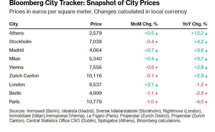 Για να καταγράψει τις τελευταίες τάσεις της αγοράς κατοικίας στις ευρωπαϊκές πόλεις, το Bloomberg συγκεντρώνει στοιχεία από διάφορους παρόχους. Ορισμένα είναι ζητούμενες τιμές και ενδεικτικά επίπεδα, ενώ άλλα είναι επίσημα στοιχεία για τις συναλλαγές. Οι τιμές της Αθήνας προέρχονται από έναν δείκτη του Spitogatos, τον οποίο το Bloomberg χρησιμοποίησε για να υπολογίσει τις μηνιαίες ζητούμενες τιμές στις πέντε περιοχές της πόλης και στη συνέχεια προέβη σε μέσο όρο αυτών των επιπέδων για να δημιουργήσει μια τιμή σε ολόκληρη την πόλη.