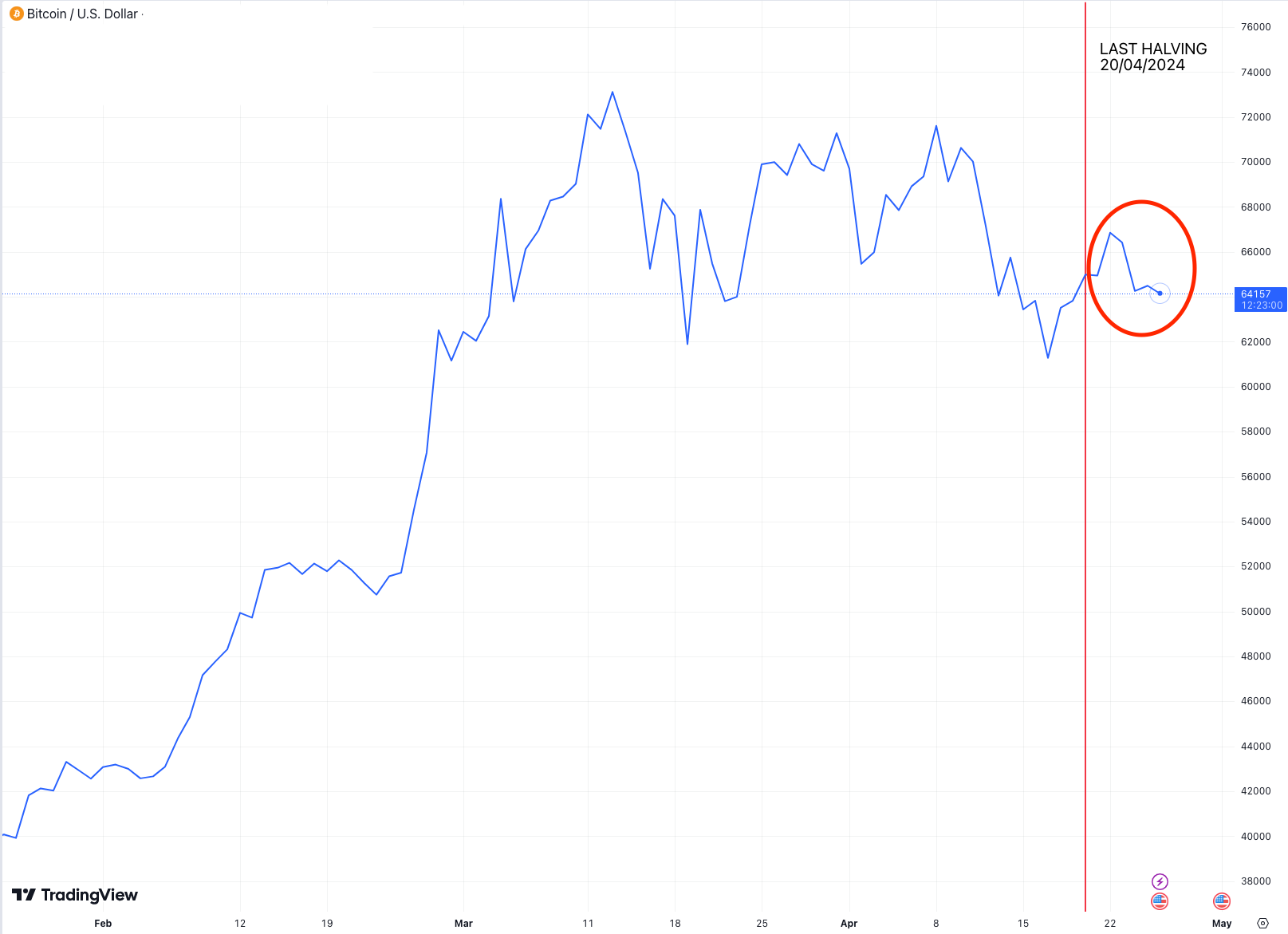 Όπως βλέπουμε όμως, από τον Φεβρουάριο (δηλαδή πριν το halving) η τιμή του Bitcoin είχε σημειώσει μια ισχυρή άνοδο, ξεκινώντας περίπου από τις $40,000 φτάνοντας κοντά στις $74,000, σημειώνοντας παράλληλα νέο ιστορικό υψηλό.
