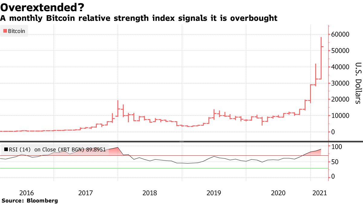 Σε τεχνικό επίπεδο, το ψηφιακό νόμισμα φαίνεται «τεντωμένο», σύμφωνα με την Miller Tabak + Co. Tο Bitcoin είναι «εξαιρετικά υπεραγορασμένο», έγραψε ο επικεφαλής στρατηγικός της εταιρείας Matt Maley. Αλλά και ο ένθερμος οπαδός του bitcoin και επικεφαλής της αυτοκινητοβιομηχανίας Tesla το περασμένο Σαββατοκύριακο δήλωσε, μέσω Twitter, πως το κρυπτονόμισμα ίσως είναι σε υψηλότερο επίπεδο από ό,τι θα έπρεπε. Ο δείκτης Bloomberg Galaxy Crypto Index, που καλύπτει τα Bitcoin, Ether και τρία άλλα ψηφιακά tokens, μειώθηκε έως και 13%.