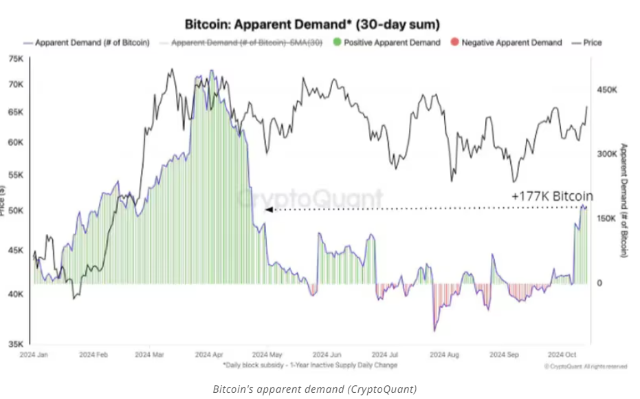 Το παρακάτω διάγραμμα δείχνει πόσο θετική και αυξανόμενη εμφανής ζήτηση προηγήθηκε των ράλι στο BTC το 2020-2021 και το 2024.