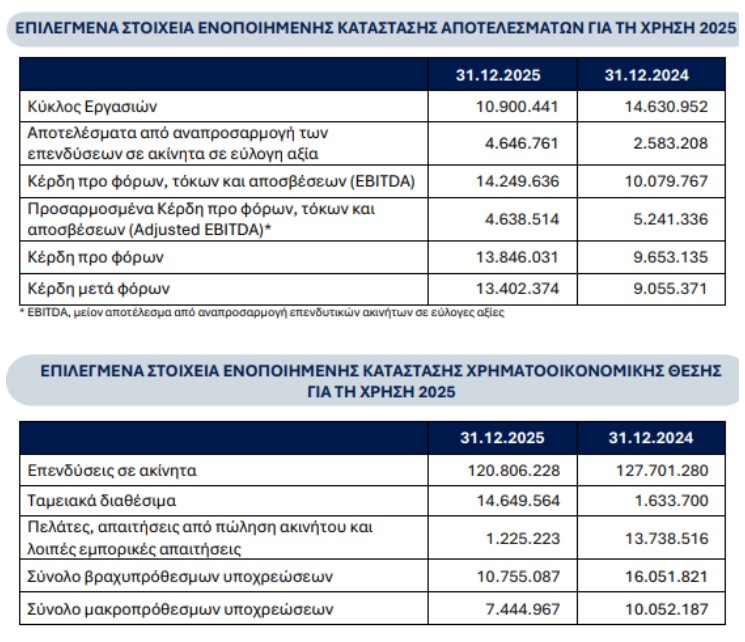 Ο κύκλος εργασιών του Ομίλου για το 2025 ανήλθε σε € 10,9 εκατ. και περιλάμβανε έσοδα από μισθώματα, τα οποία ανήλθαν σε € 6,1 εκατ. καθώς και έσοδα από πώληση ακινήτου, τα οποία ανήλθαν σε € 4,8 εκατ..