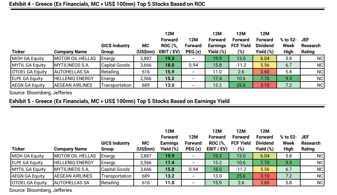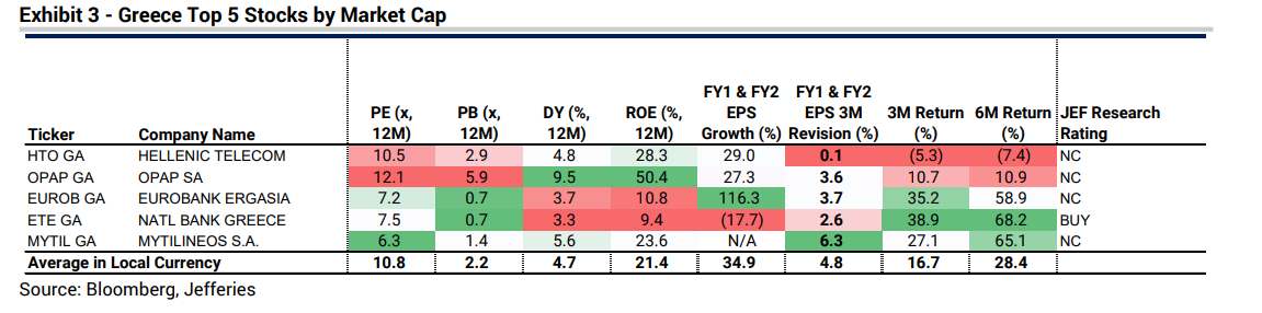 Tο Χρηματιστήριο Αθηνών τελεί υπό καθεστώς «διόρθωσης», ωστόσο όλα τα στοιχεία τα οποία υπονοούν «ευκαιρία για επένδυση» υπάρχουν: ισχυρό ονομαστικό ΑΕΠ, βελτίωση στο ισοζύγιο τρεχουσών συναλλαγών χάρη στο μειωμένο κόστος εισαγωγής ενέργειας και επανεκτίμηση επί τα βελτίω της υγείας του χρηματοπιστωτικού συστήματος, αναφέρει η Jefferies. Φυσικά, μερικές από τις ισχυρότερες αναθεωρήσεις κερδών παγκοσμίως έχουν επίσης βοηθήσει. Η Jefferies, μάλιστα, ξεκίνησε πρόσφατα να καλύπτει τις ελληνικές τράπεζες.