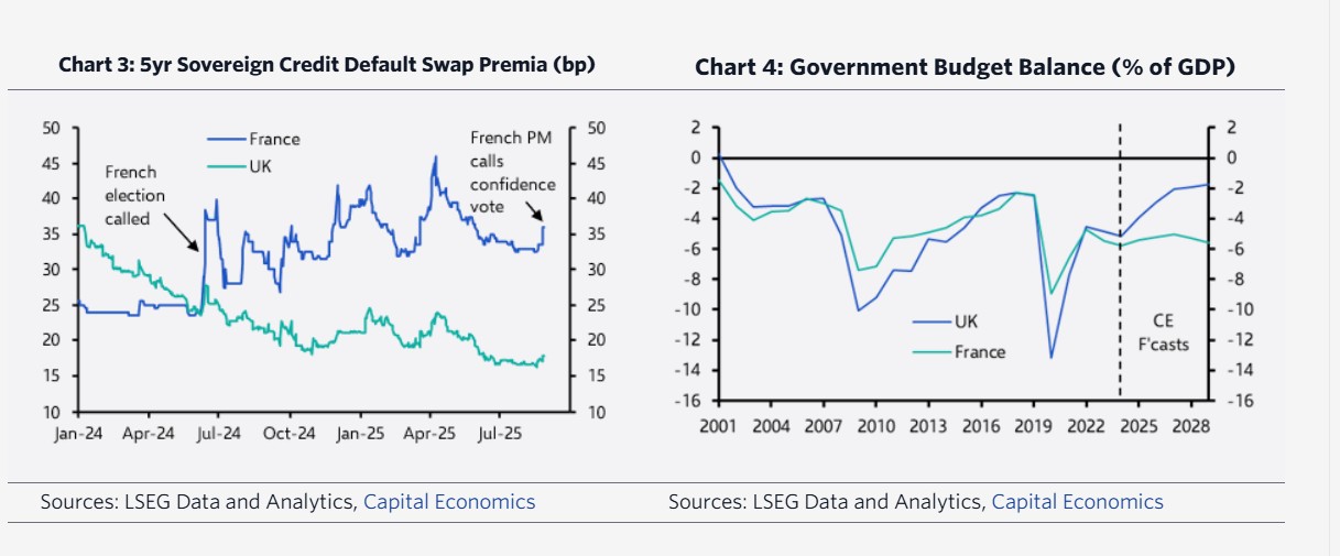 Η αγορά αντανακλά αυτές τις διαφορές: υψηλότερα CDS στη Γαλλία, αλλά χωρίς σημάδια άμεσης κρίσης. Η ουσία είναι πως, ενώ τα σενάρια περί «επόμενης διάσωσης από το ΔΝΤ» προσελκύουν τίτλους και συγκρίσεις με το παρελθόν, η πραγματικότητα δείχνει ότι οι μεγάλες ευρωπαϊκές οικονομίες βρίσκονται σε διαφορετική κατηγορία, καταλήγει η Capital Economics.