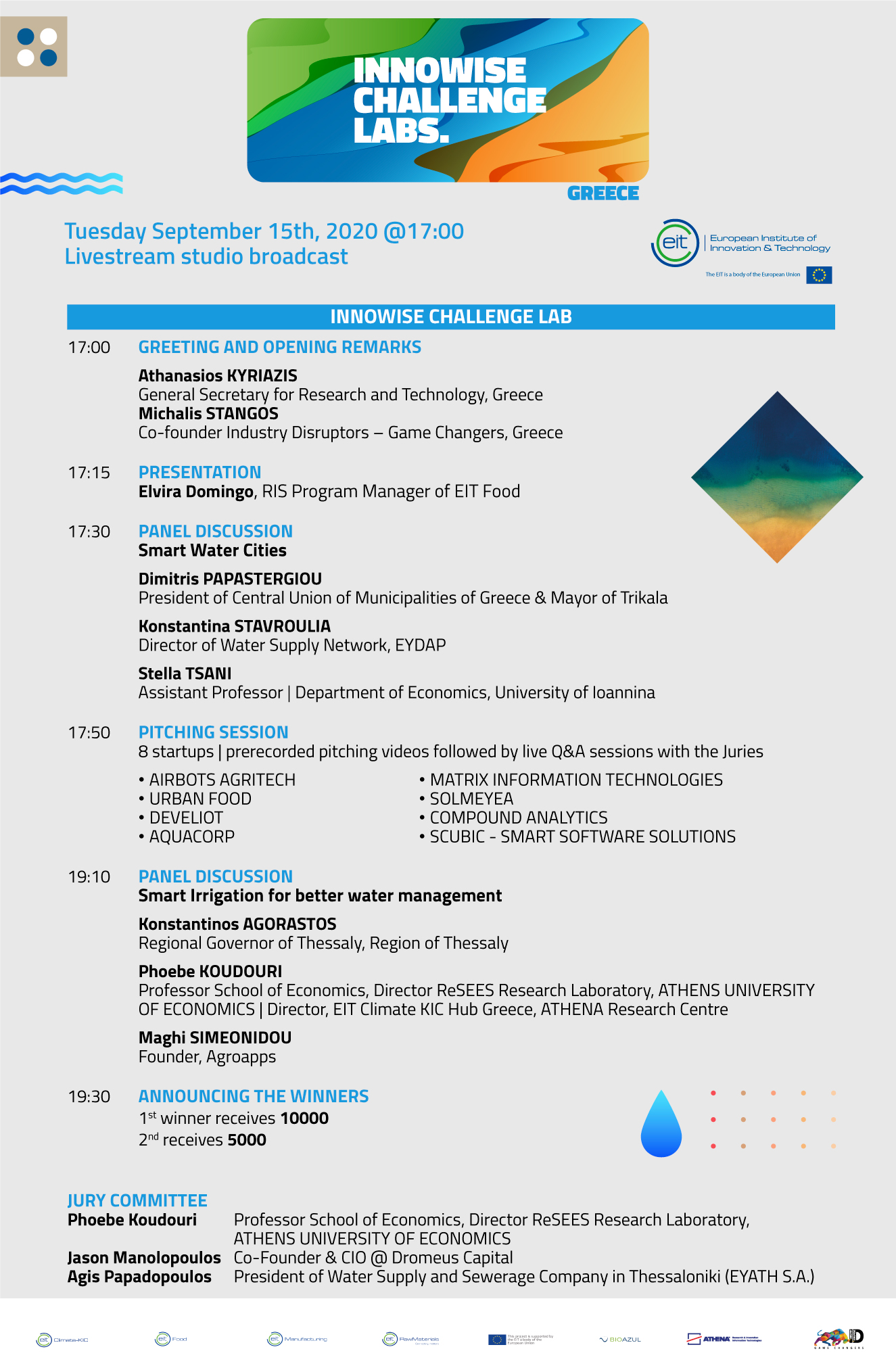 Στο πλαίσιο της εκδήλωσης του τελικού θα διεξαχθούν δύο συζητήσεις πάνελ με θέμα τη διαχείριση των υδατικών πόρων στο αστικό και αγροτικό περιβάλλον καθώς και τις προκλήσεις στην εφαρμογή και διάδοση των καινοτόμων εφαρμογών που υπόσχονται αποτελεσματικότερη διαχείριση του νερού στα δίκτυα ύδρευσης και άρδευσης.