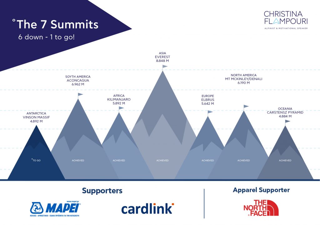 Η ιστορία της Χριστίνας μας εμπνέει καθημερινά να κυνηγήσουμε τις δικές μας κορυφές όσo μεγάλες ή μικρές και αν είναι. Ξεκίνησε από την ψηλότερη κορυφή της Ευρώπης – το Elbrus (5.642μ.) στην Ρωσία. Συνέχισε στην ψηλότερη κορυφή της Αφρικής – το Kilimanjaro (5.895μ.) στην Τανζανία-, την ψηλότερη της Β. Αμερικής – το Denali (6.194μ.) στην Αλάσκα-, την ψηλότερη κορυφή της Ωκεανίας – το Carstensz Pyramid (4.884μ.) στην Παπούα – και την ψηλότερη της Νοτίου Αμερικής – την Aconcagua (6.962μ.) στην Αργεντινή. Τον Μάιο του 2020 έγινε η πρώτη Ελληνίδα που πάτησε στην ψηλότερη κορυφή του κόσμου, στο Έβερεστ (8.848μ.).