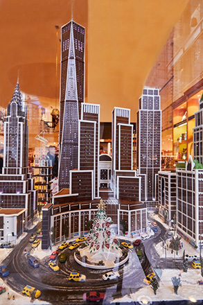 Η Μίλερ προχώρησε: τοποθέτησε ανάμεσα στα κτίρια, δύο πολυκατοικίες και μία μονοκατοικία. Μετρό, ταξί, ανθρωπάκια. Ένα κτίριο υπό οικοδόμηση, σακούλες με σκουπίδια στα πεζοδρόμια, παιδιά να παίζουν στο Central Park, τουρίστες να παίρνουν φωτογραφίες. Και κάποιες χριστουγεννιάτικες λεπτομέρειες, όπως κάποιον που πουλάει χριστουγεννιάτικα δέντρα, αγιοβασίληδες να σουλατσάρουν στα πεζοδρόμια. Δρόμοι καλυμμένοι με γλάσο (για να δηλώνεται ότι έχει χιονίσει και ότι υπάρχει πατημένο βρώμικο χιόνι στον δρόμο). Δέντρα από αποξηραμένον άνηθο και δεντρολίβανο.