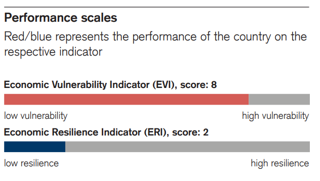 Η ελληνική οικονομία βασίζεται σε μεγάλο βαθμό στους δύο κύριους τομείς της, τον τουρισμό και τη ναυτιλία, γεγονός που έχει οδηγήσει σε έλλειψη οικονομικής διαφοροποίησης. Ωστόσο, η κύρια πρόκληση της χώρας όσον αφορά την ανθεκτικότητα έγκειται στη δημοσιονομική της κατάσταση.