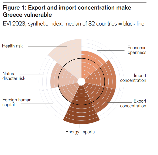 Ταυτόχρονα, ωστόσο, αυτές οι εμπορικές σχέσεις έχουν επίσης εκθέσει την οικονομία της σε πιθανούς γεωπολιτικούς κινδύνους. Το πιο σημαντικό, ο λόγος πίσω από τη σημαντική συγκέντρωση εξαγωγών και εισαγωγών της Ελλάδας έγκειται στη συγκέντρωση προϊόντων της.