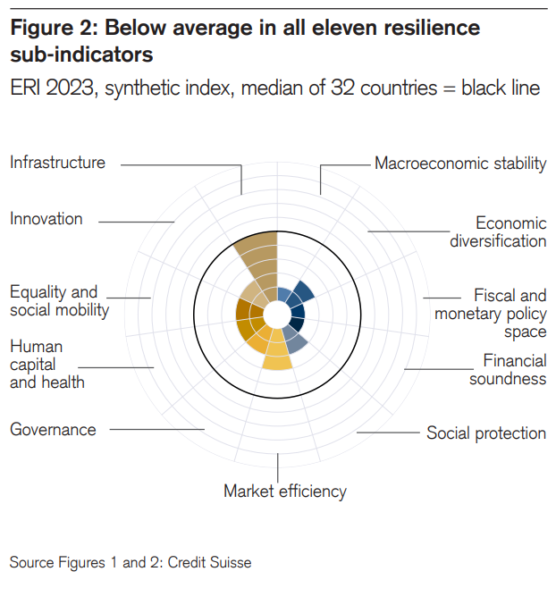 Στις τελευταίες θέσεις του δείκτη ανθεκτικότητας της ελβετικής τράπεζας Credit Suisse φιγουράρει η χώρα μας. Όπως επισημαίνεται σε σχετική μελέτη, η Ελλάδα «δεν πιάνει τη βάση στους 11 δείκτες ανθεκτικότητας, λόγω της μεγάλης οικονομικής εξάρτησης από δύο κλάδους, τον τουρισμό και τη ναυτιλία, καθώς και εξαιτίας μη βιώσιμων δημοσιονομικών πολιτικών.