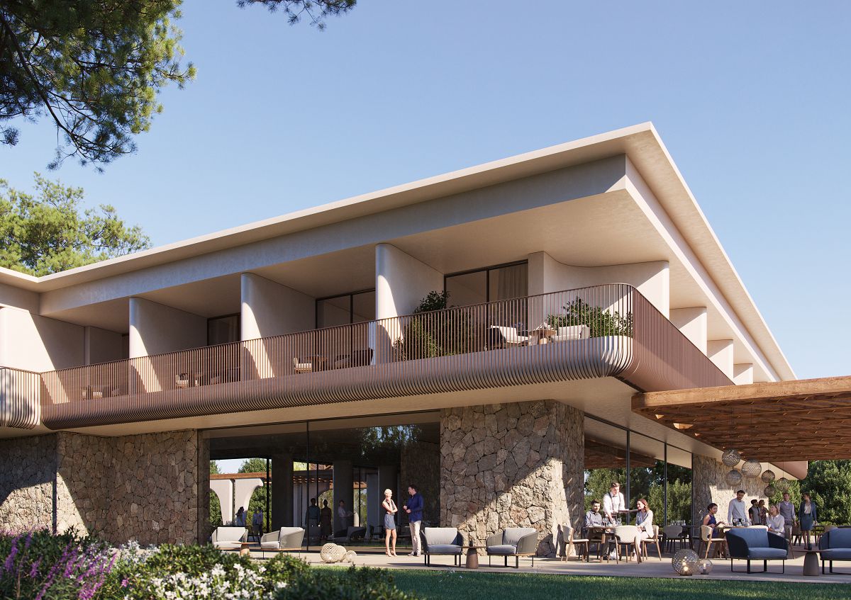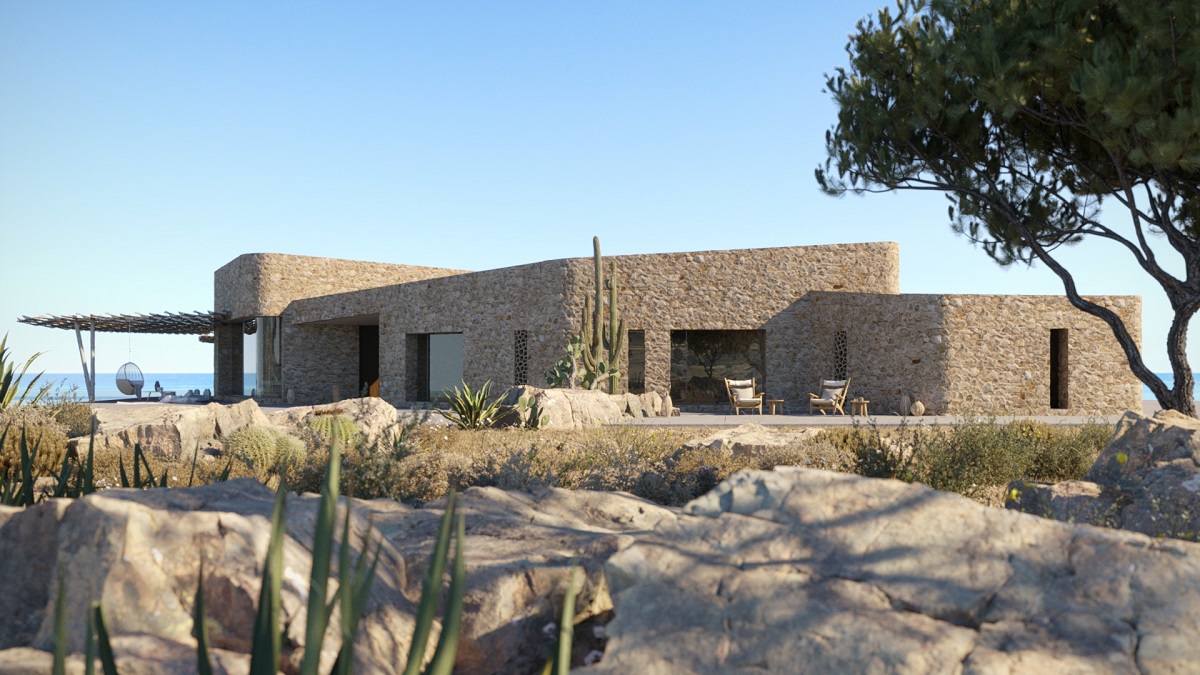 Ακολουθώντας τη γεωμετρική τυχαιότητα της γενικής διάταξης, όπως αυτή σχηματοποιείται στο ίχνος των γλυπτικών, λίθινων τοίχων κατά μήκος του δικτύου πεζοδρόμων, τα κτίρια καταλυμάτων από πέτρα και κάποια από σοβά ενσωματώνονται ισορροπημένα στους εδαφικούς κυματισμούς. Οι προστατευμένες, μεσογειακές αυλές τους ανοίγονται προς τη θέα αποτελώντας συνέχεια των εσωτερικών χώρων, το «μέσα» με το «έξω» ενοποιείται. Η ποιητική των υλικών έχει τον δικό της συμβολισμό, το δικό της λεξιλόγιο, ενώ η αλληλεπίδραση με το φως επιτρέπει να αναδειχθούν αναπάντεχες σχέσεις και αντιθέσεις μαγνητίζοντας το βλέμμα. Δημόσιοι και ιδιωτικοί «κήποι» αγκαλιάζουν τα κτίσματα, που θυμίζουν εδαφική προέκταση, σαν ανασήκωμα του τοπίου. Η φύση κυριαρχεί. Το «Slow Living Resort» είναι απαλό, προσαρμόζεται στο φυσικό ανάγλυφο, κάπου υποχωρεί σημειακά, και ταυτόχρονα δηλώνει την παρουσία του. «Απ’ άκρη σ’ άκρη του χώρου, σε ένα συνεχές, βιωματικό παρόν υπάρχει ο Άνθρωπος».