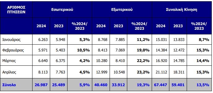 Ο αριθμός των πτήσεων στον Διεθνή Αερολιμένα Αθηνών κατά τη διάρκεια των τεσσάρων πρώτων μηνών του 2024 ανήλθε σε 67.447, καταγράφοντας αύξηση της τάξης του 13,5% σε σχέση με την αντίστοιχη περίοδο του 2023.