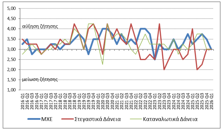 Η ζήτηση για στεγαστικά και καταναλωτικά δάνεια παρέμεινε αμετάβλητη κατά το α΄ τρίμηνο του 2026 (Διάγραμμα 2), ενώ αμετάβλητη αναμένεται να παραμείνει και κατά το β΄ τρίμηνο του 2026.