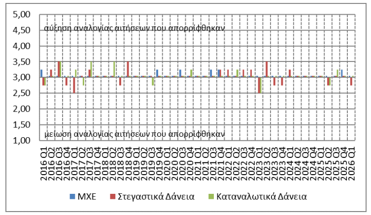 Κατά το α΄ τρίμηνο του 2026, η αναλογία των αιτήσεων για στεγαστικά δάνεια που απορρίφθηκαν παρέμεινε σχεδόν αμετάβλητη, ενώ για καταναλωτικά παρέμεινε αμετάβλητη (Διάγραμμα 3).