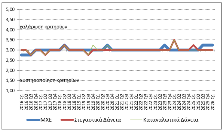Κατά το α΄ τρίμηνο του 2026, τα κριτήρια χορήγησης στεγαστικών και καταναλωτικών δανείων προς τα νοικοκυριά παρέμειναν αμετάβλητα σε σχέση με το δ΄ τρίμηνο του 2025 (Διάγραμμα 1), ενώ αμετάβλητα αναμένεται να παραμείνουν και κατά τη διάρκεια του β΄ τριμήνου του 2026. Οι συνολικοί όροι χορήγησης στεγαστικών δανείων έγιναν πιο αυστηροί ως έναν βαθμό, λόγω των αυξήσεων στις επιβαρύνσεις των δανείων εκτός τόκων, κατά την διάρκεια του α΄ τριμήνου του 2026. Οι συνολικοί όροι χορήγησης των καταναλωτικών και λοιπών δανείων παρέμειναν αμετάβλητοι για το α΄ τρίμηνο του 2026.