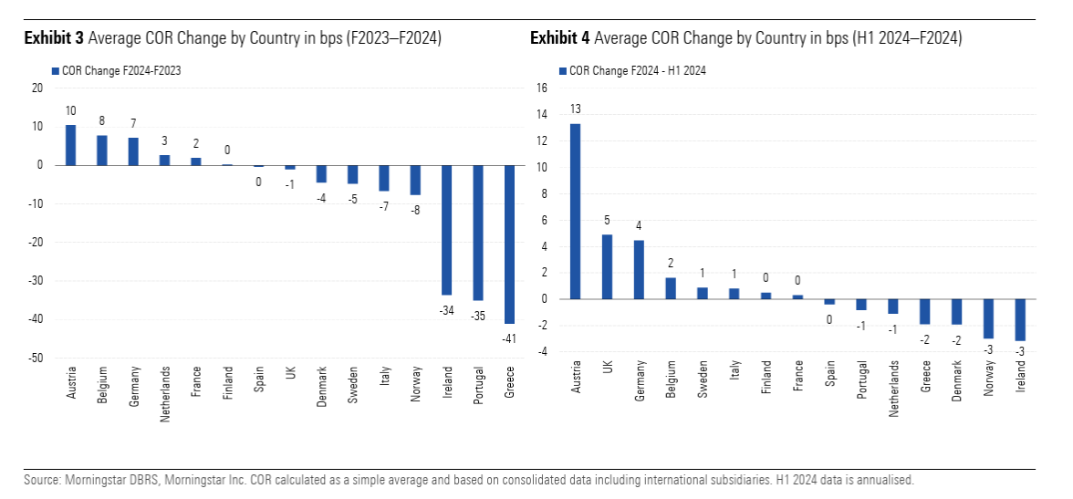 Αντιθέτως, οι τράπεζες στην Αυστρία, το Βέλγιο και τη Γερμανία σημείωσαν τις μεγαλύτερες αυξήσεις στο COR από το 2023, αν και αυτές θεωρούνται γενικά περιορισμένες (7–10 μονάδες βάσης) και από χαμηλά επίπεδα.