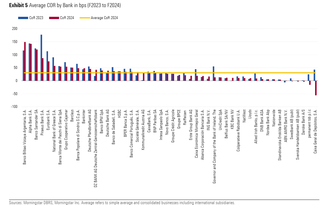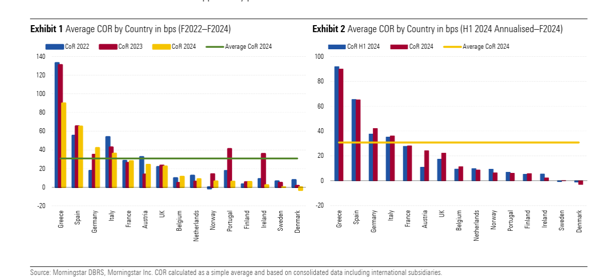 Σύμφωνα με την DBRS, o μέσος όρος του COR στο δείγμα των χωρών που καλύπτει ήταν 31 μονάδες βάσης (bps) το 2024, ουσιαστικά σταθερός σε σχέση με τις 30 μονάδες βάσης στο Α’ εξάμηνο του 2024, και ελαφρώς βελτιωμένος από τις 39 μονάδες βάσης το 2023 και τις 36 μονάδες βάσης το 2022. Αυτά τα επίπεδα παραμένουν σημαντικά χαμηλότερα από τις 107 μονάδες βάσης του 2020.