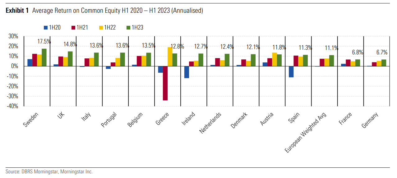 Οι ευρωπαϊκές τράπεζες, επωφελούμενες από τη σημαντική βελτίωση στην κερδοφορία η οποία καταγράφηκε το πρώτο εξάμηνο του 2023, σημείωσαν ετήσια αύξηση της μέσης απόδοσης ιδίων κεφαλαίων (ROE) κατά 11,1% από 7,7%, με τις ελληνικές να ξεπερνούν σημαντικά αυτό το επίπεδο (12,8%).