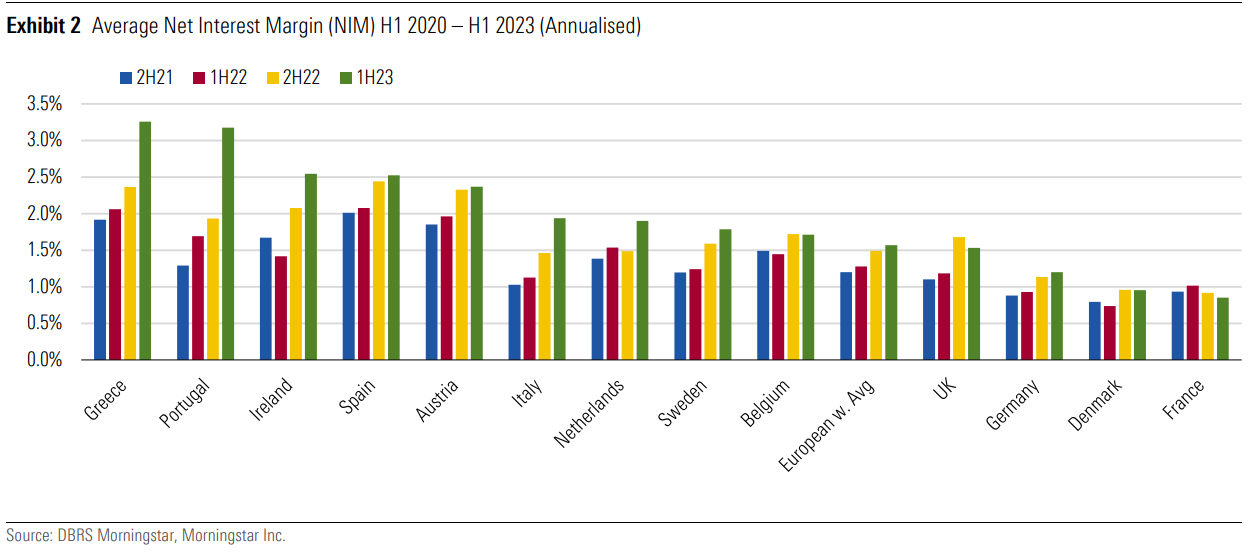 Επίσης, η διεύρυνση των καθαρών επιτοκιακών περιθωρίων από τα μέσα του 2022 ήταν ο κύριος μοχλός για την κερδοφορία των τραπεζών στην Ευρώπη.