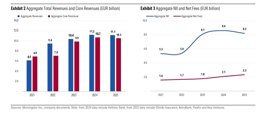 Σύμφωνα με την DBRS, τα συνολικά έσοδα μειώθηκαν κατά 1% σε ετήσια βάση το 2025, καθώς η αύξηση των καθαρών εσόδων από προμήθειες και λοιπών μη επιτοκιακών εσόδων αντιστάθμισε μόνο εν μέρει τη μείωση των NII.