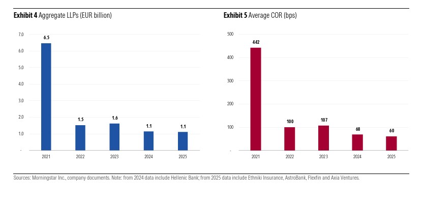 Το κόστος κινδύνου (CoR) και οι δείκτες ποιότητας ενεργητικού βελτιώθηκαν περαιτέρω το 2025, υποστηριζόμενοι από ισχυρή πιστωτική ανάπτυξη, αν και το 2026 ενδέχεται να υπάρξουν πιέσεις λόγω γεωπολιτικών και εμπορικών εντάσεων. Αβεβαιότητα παραμένει ωστόσο αναφορικά με τις επιπτώσεις της αναθεώρησης από τον Άρειο Πάγο της μεθοδολογίας υπολογισμού επιτοκίων για τιτλοποιήσεις στο πλαίσιο του Νόμου Κατσέλη.