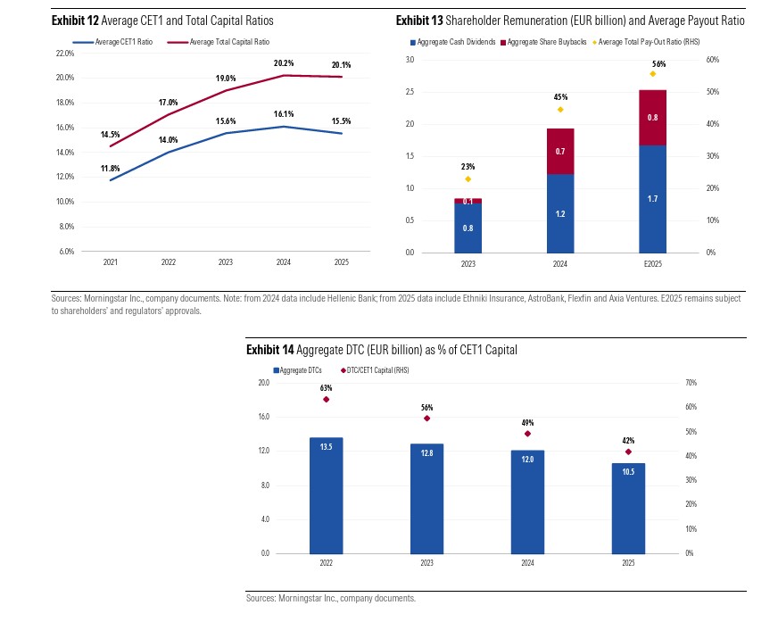 Για το 2026, τα κεφαλαιακά περιθώρια ενδέχεται να μειωθούν ελαφρώς, καθώς οι τράπεζες σχεδιάζουν αυξημένες διανομές προς τους μετόχους ή ενδεχόμενες νέες εξαγορές. Συνολικά, προγραμματίζεται διανομή περίπου 2,5 δισ. ευρώ από τα κέρδη του 2025, αυξημένη κατά 31% σε ετήσια βάση, με μέσο ποσοστό διανομής περίπου 56%. Παράλληλα, η ποιότητα κεφαλαίου βελτιώθηκε, με τις αναβαλλόμενες φορολογικές απαιτήσεις (DTC) να αντιπροσωπεύουν περίπου το 42% του CET1, έναντι 49% το 2024.