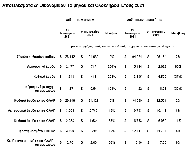 Τα έσοδα του τέταρτου τριμήνου αυξήθηκαν κατά 9% στα 26,1 δισεκατομμύρια δολάρια. Η εταιρεία παρήγαγε λειτουργικά έσοδα ύψους 2,2 δισεκατομμυρίων δολαρίων, σημειώνοντας αύξηση 204% την ίδια περίοδο το προηγούμενο έτος και λειτουργικά έσοδα εκτός GAAP ύψους 3,3 δισεκατομμυρίων δολαρίων, αύξηση 19%. Τα καθαρά έσοδα ανήλθαν σε 1,3 δισεκατομμύρια δολάρια, τα καθαρά έσοδα εκτός GAAP σε 2,3 δισεκατομμύρια δολάρια και τα προσαρμοσμένα λειτουργικά κέρδη προ φόρων, τόκων και αποσβέσεων (EBITDA) σε 3,8 δισεκατομμύρια δολάρια. Οι ταμειακές ροές από τις επιχειρήσεις ανήλθαν σε 5,9 δισεκατομμύρια δολάρια. Το τέταρτο τρίμηνο τα απομειωμένα κέρδη ανά μετοχή ανήλθαν σε $1.57 και τα απομειωμένα κέρδη ανά μετοχή εκτός GAAP σε $2,70.