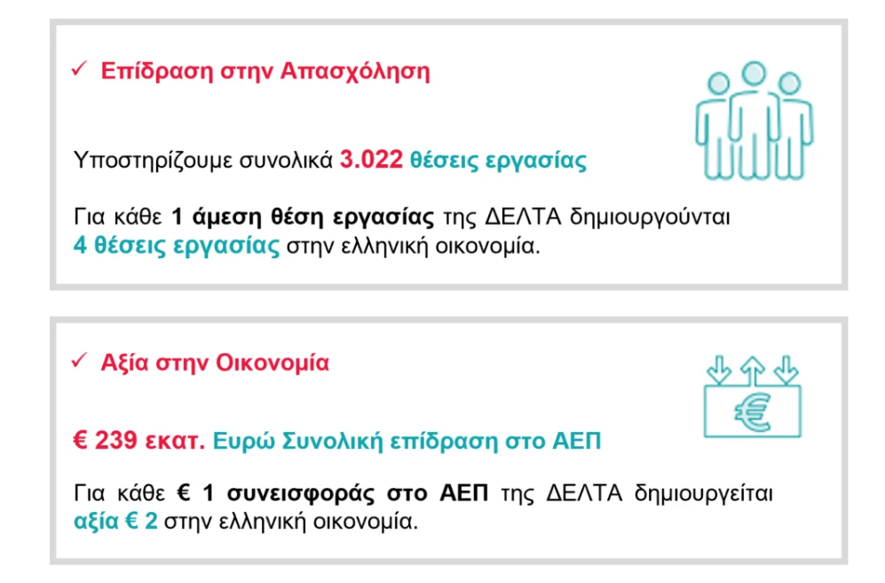 Αυτό πρακτικά σημαίνει ότι για κάθε € 1 συνεισφοράς στο ΑΕΠ της ΔΕΛΤΑ δημιουργείται αξία € 2 στην εθνική οικονομία, και για κάθε 1 άμεση θέση εργασίας στη ΔΕΛΤΑ δημιουργούνται 4 θέσεις εργασίας στην ελληνική οικονομία.