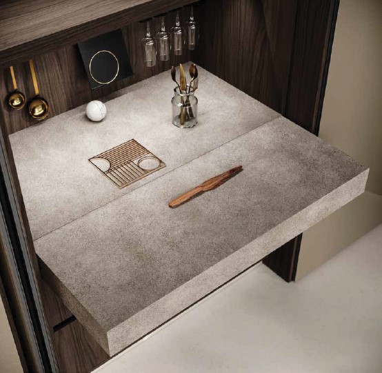 ΚΡΥΦΗ ΣΥΡΟΜΕΝΗ ΕΠΙΦΑΝΕΙΑ: Η ανάγκη για εξοικονόμηση χώρου δημιούργησε λύσεις όπως οι συρόμενοι πάγκοι. Μια επιφάνεια εργασίας η οποία όταν δεν είναι σε χρήση μπορεί να κρυφτεί μέσα στο ντουλάπι.